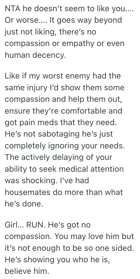 After the accident, she was in severe pain and tried to reach out to Tre for help. He initially showed concern but quickly became unresponsive. Instead of taking her to the hospital immediately, he decided to take a shower and later even went to sleep while she was waiting for medical attention. This lack of urgency and support left her feeling abandoned and hurt.