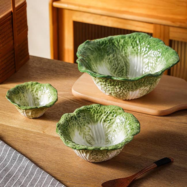 A set of large ceramic cabbage bowls, because I think we can all agree that food tastes better when it's coming out of something this dang adorable. Whether you're serving a classic chicken Caesar during girls' night or having some leftover Cacio e Pepe on your lonesome, these microwave-, dishwasher-, AND freezer-safe (!!) dishes will make dining at home your only preference. Plus, the various sizes will make it 10 times easier to stack and stash in the cupboard!