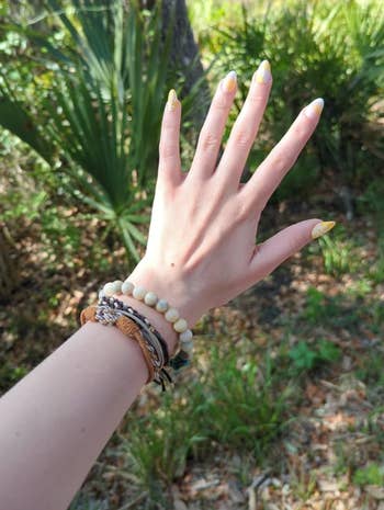 "I love these! These add the cutest touch to any outfit. They make you feel better about wearing a hair tie on your wrist. And they function great as both a hair tie and a bracelet! Not too tight to wear as either. Love them!" —Tiara Scheurell